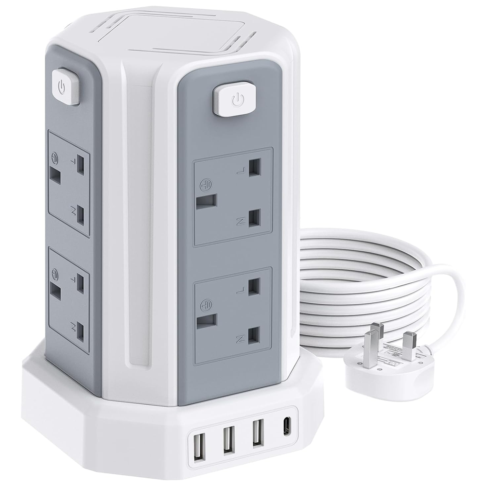 Tower Extension Lead 2M, (13A 3250W) 4 USB Ports and 8 Way Extension Tower In Stock
